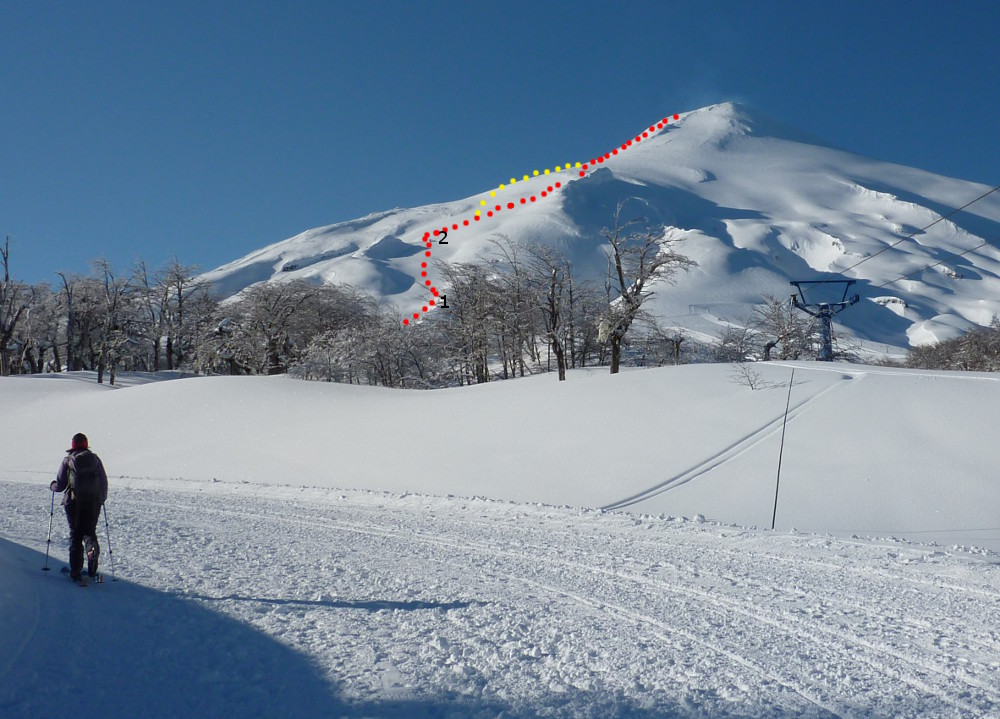 The yellow route is the alternative to our ascent routes (red route). "1" is the top of the chairlift. "2" is the concrete top station from an old lift.